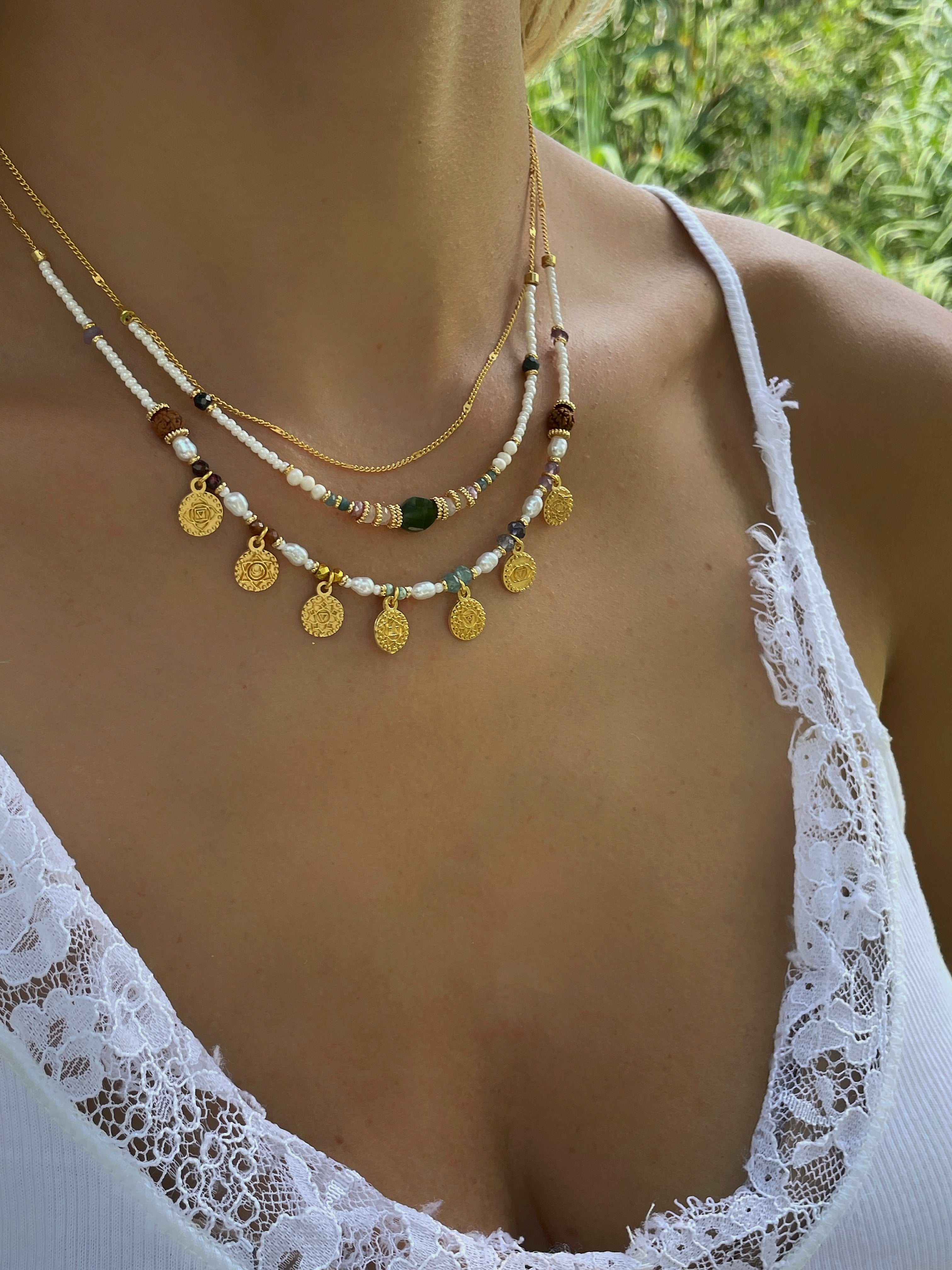 Este collar esta creado con 7 mini monedas con los símbolos y piedras de cada chakra. deseamos que este collar te ayude a recordar que eres energía, y no es casualidad que hoy llegue a ti esta pieza, pues la medicina ancestral del reino mineral esta deseando conectar contigo va que los cristales son grandes aliados para equilibrar y expandir nuestra energía.