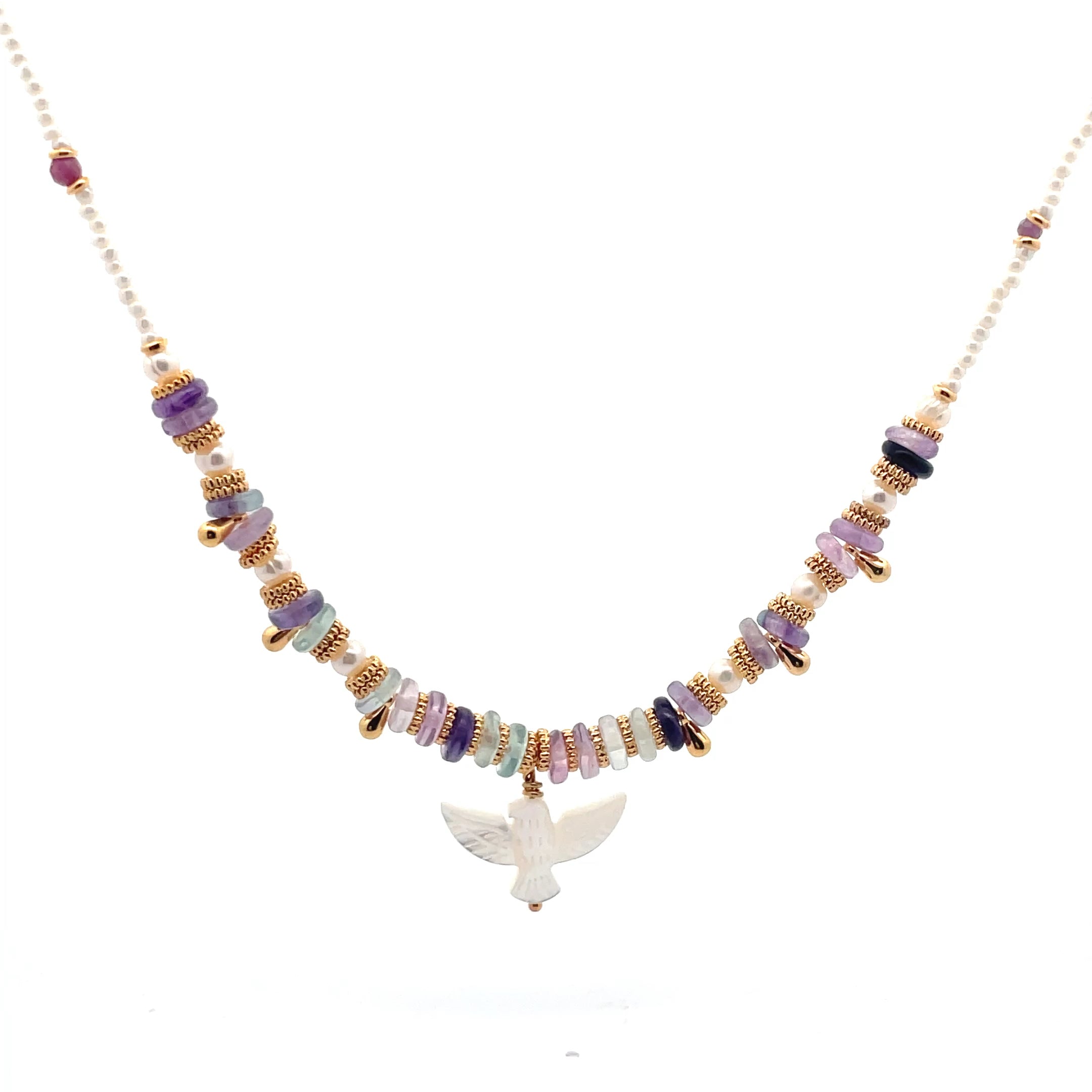Collar co flouritas, perlas y miyuki aperlada componentes de latón con baño de oro, dije de águila 🦅 al centro de madre perla.