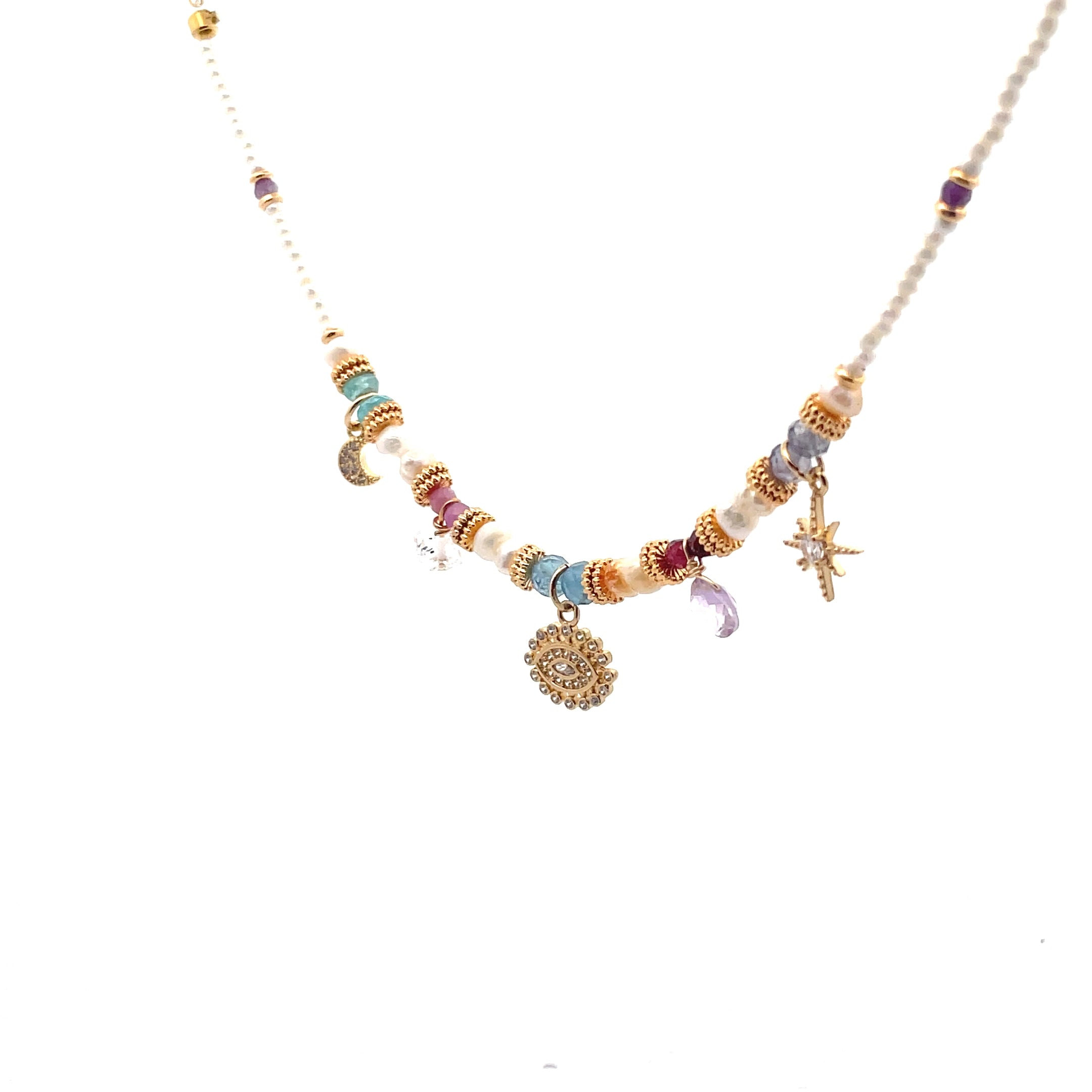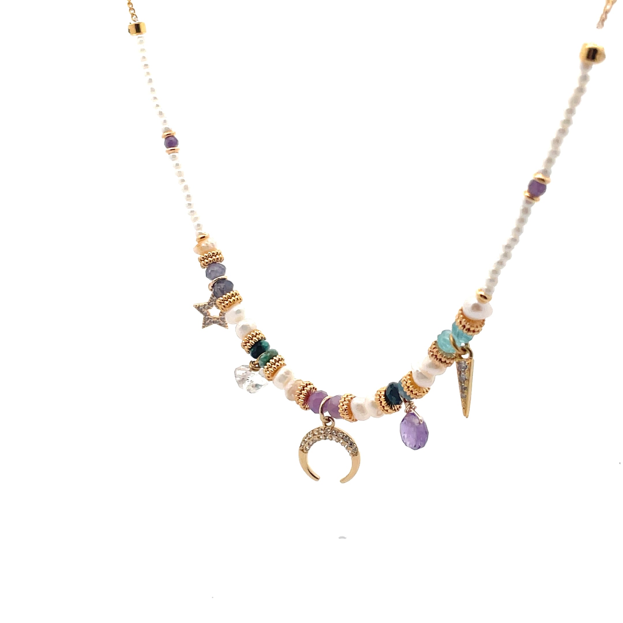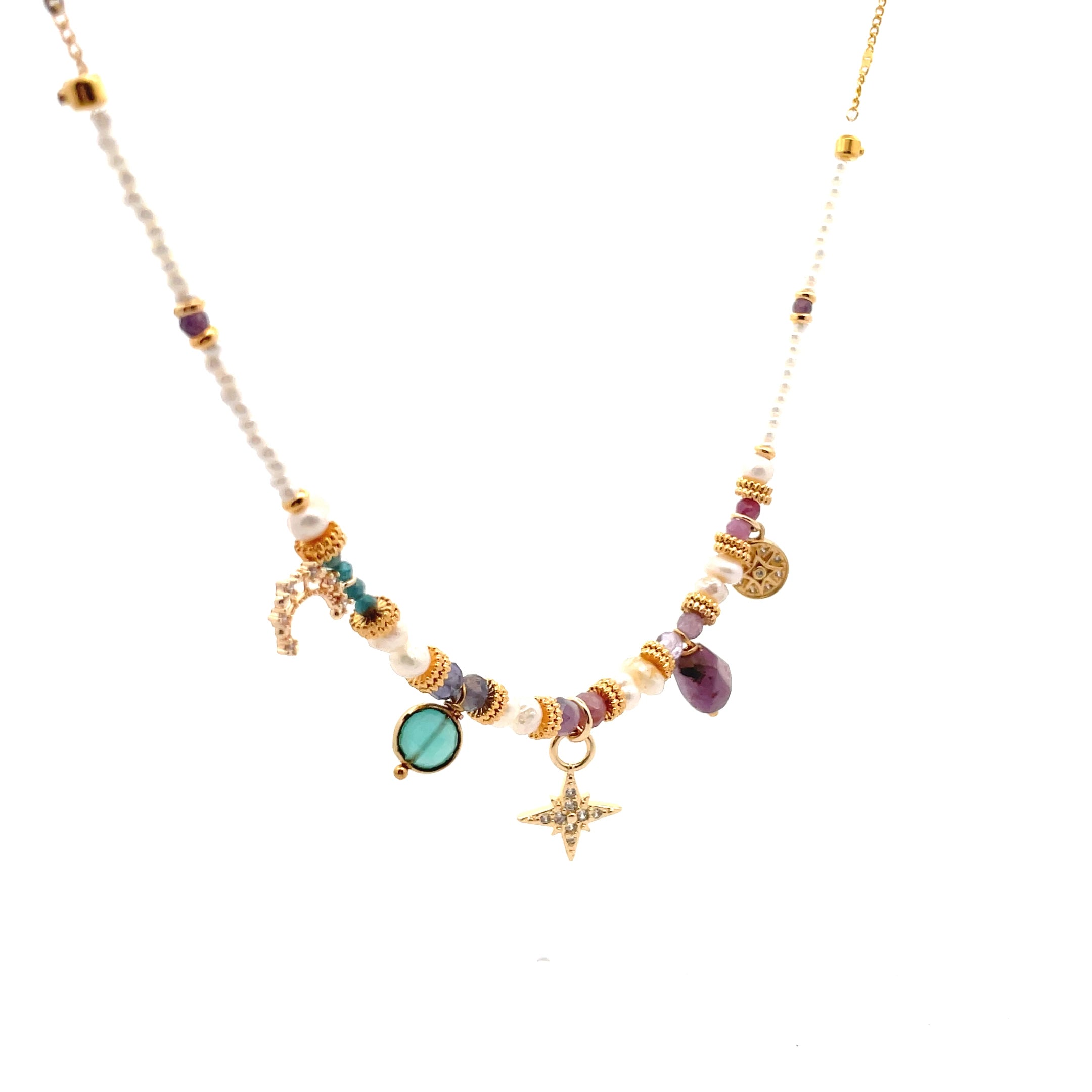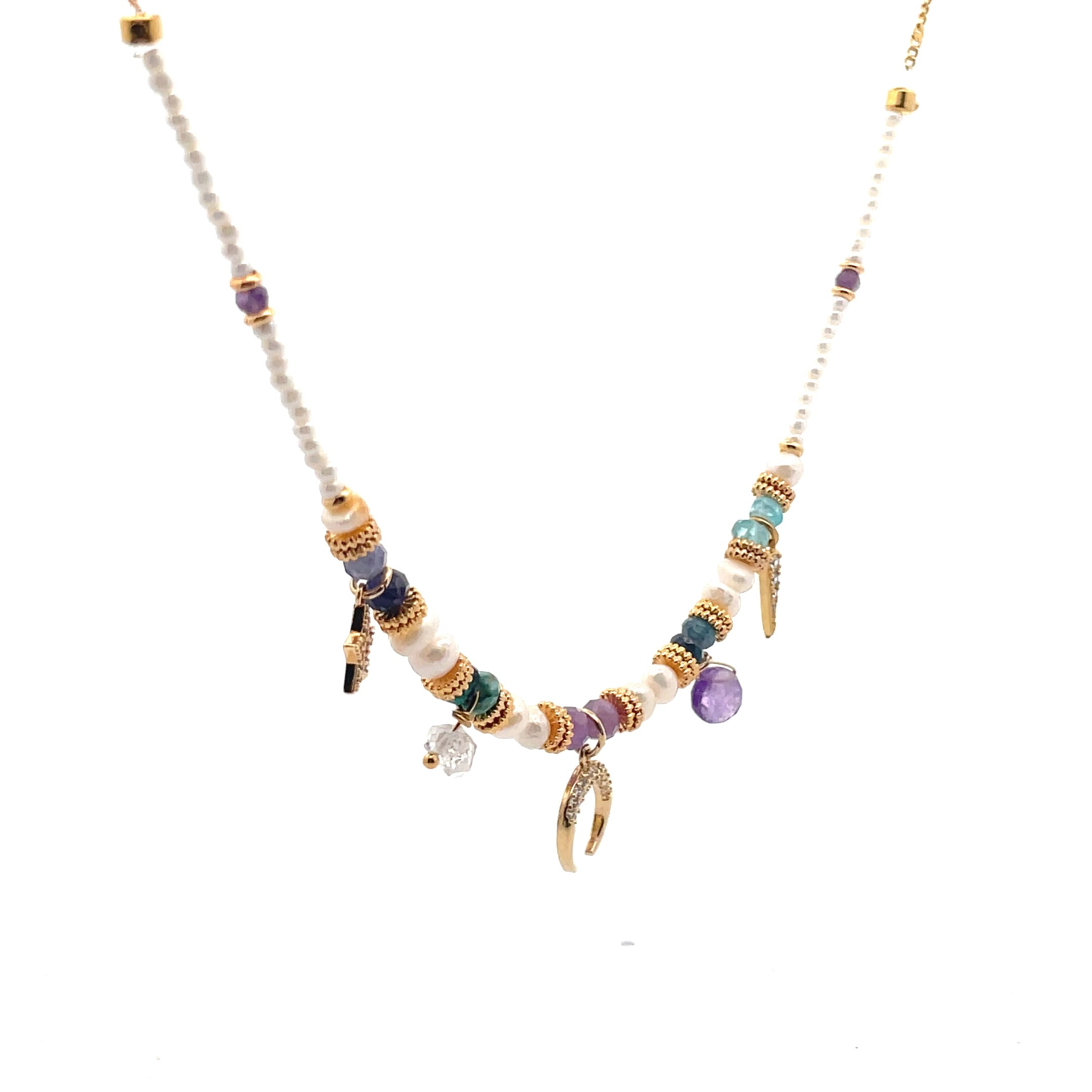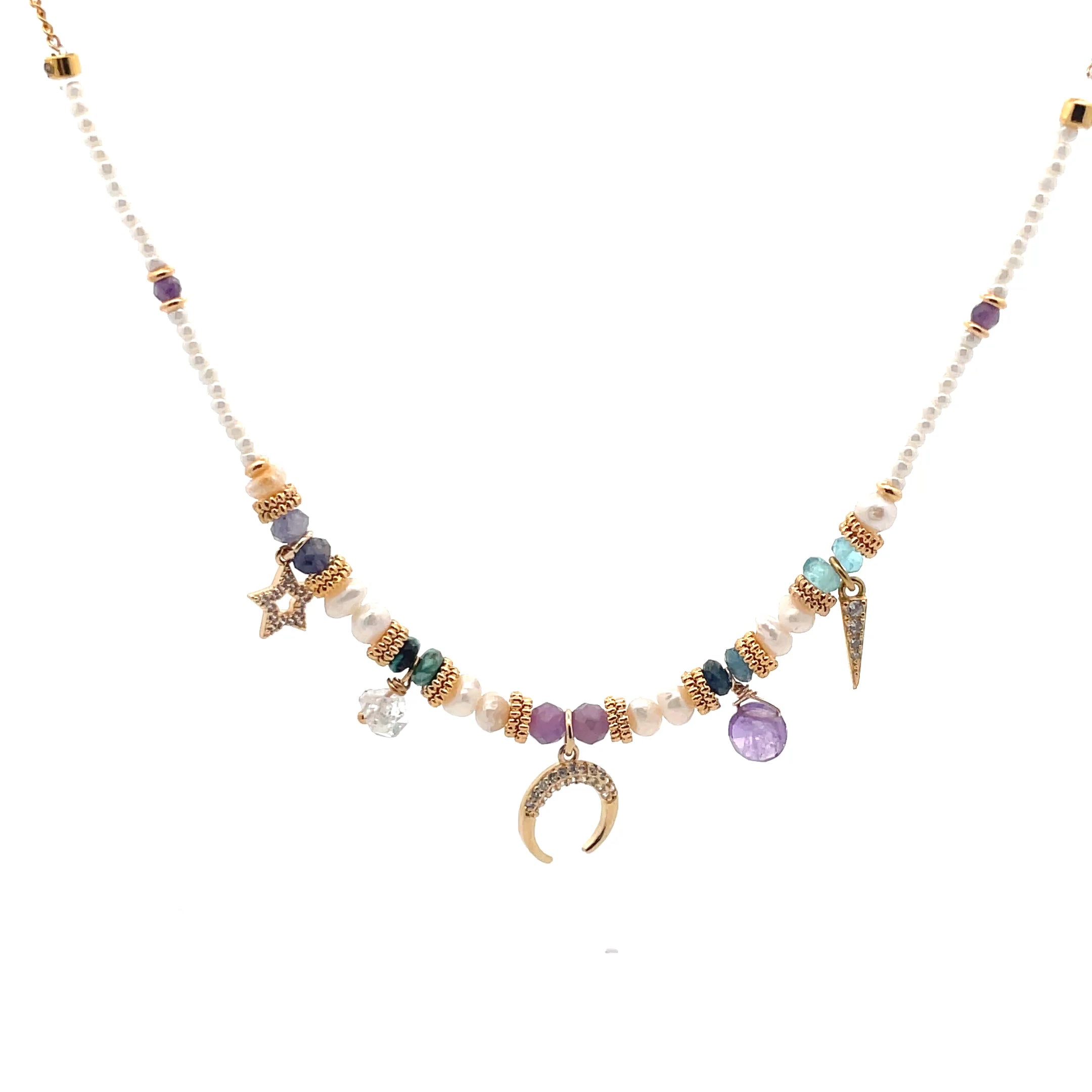 Collar con dijes de circonia de latón con baño de oro, miyuki aperladas, perlas, y multí piedras.