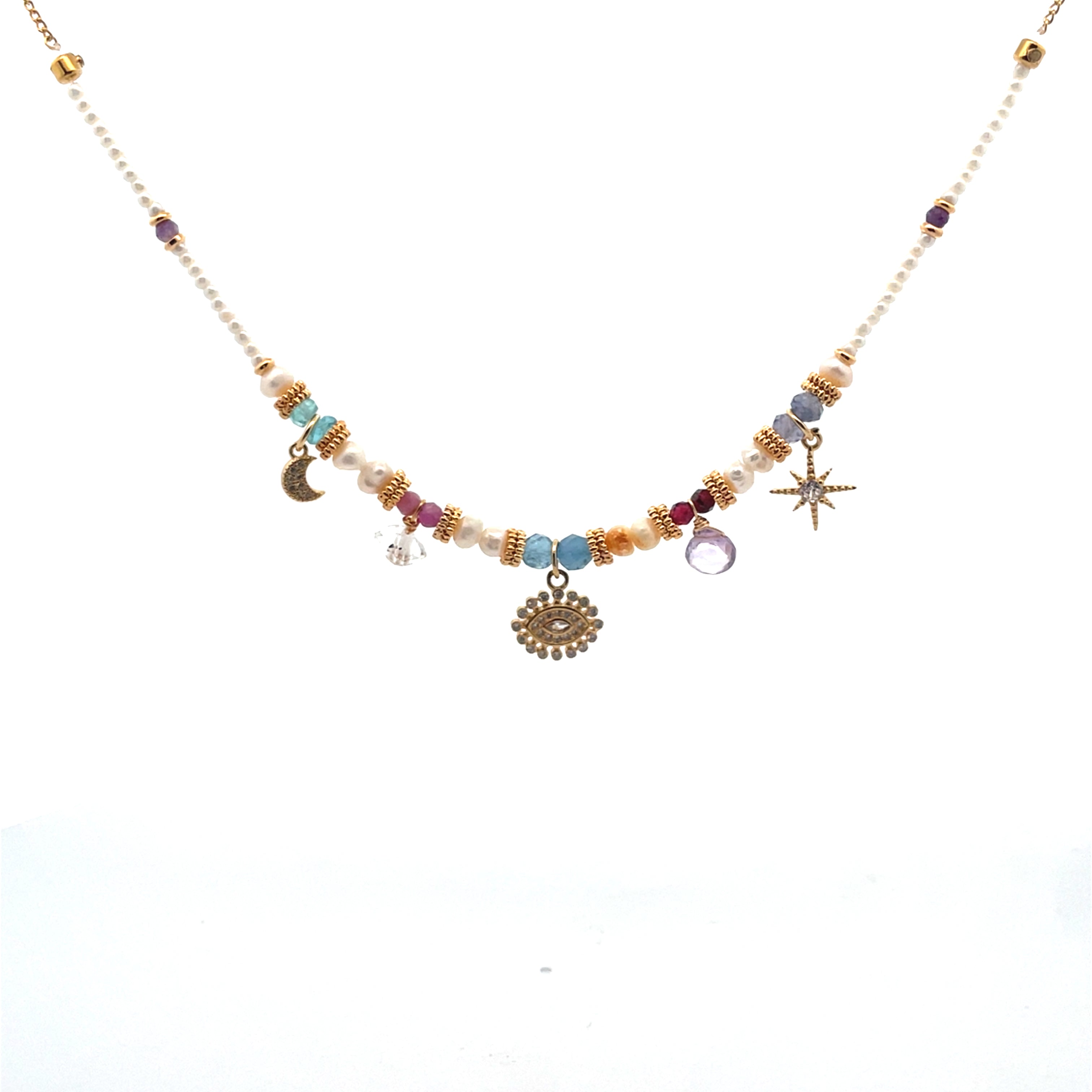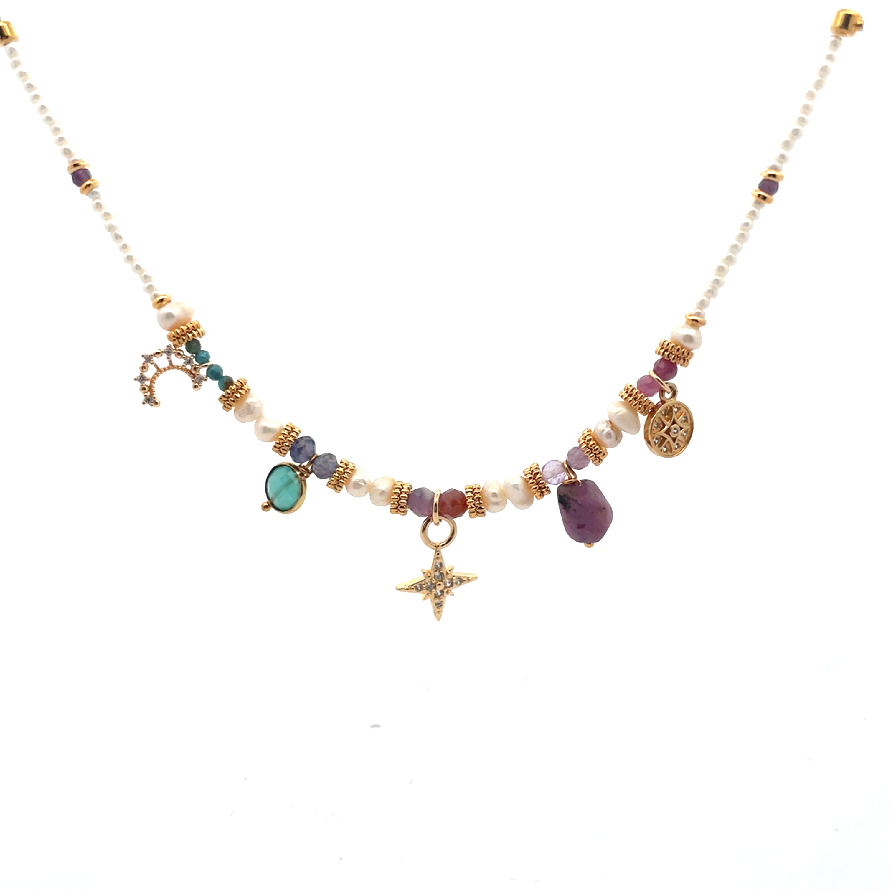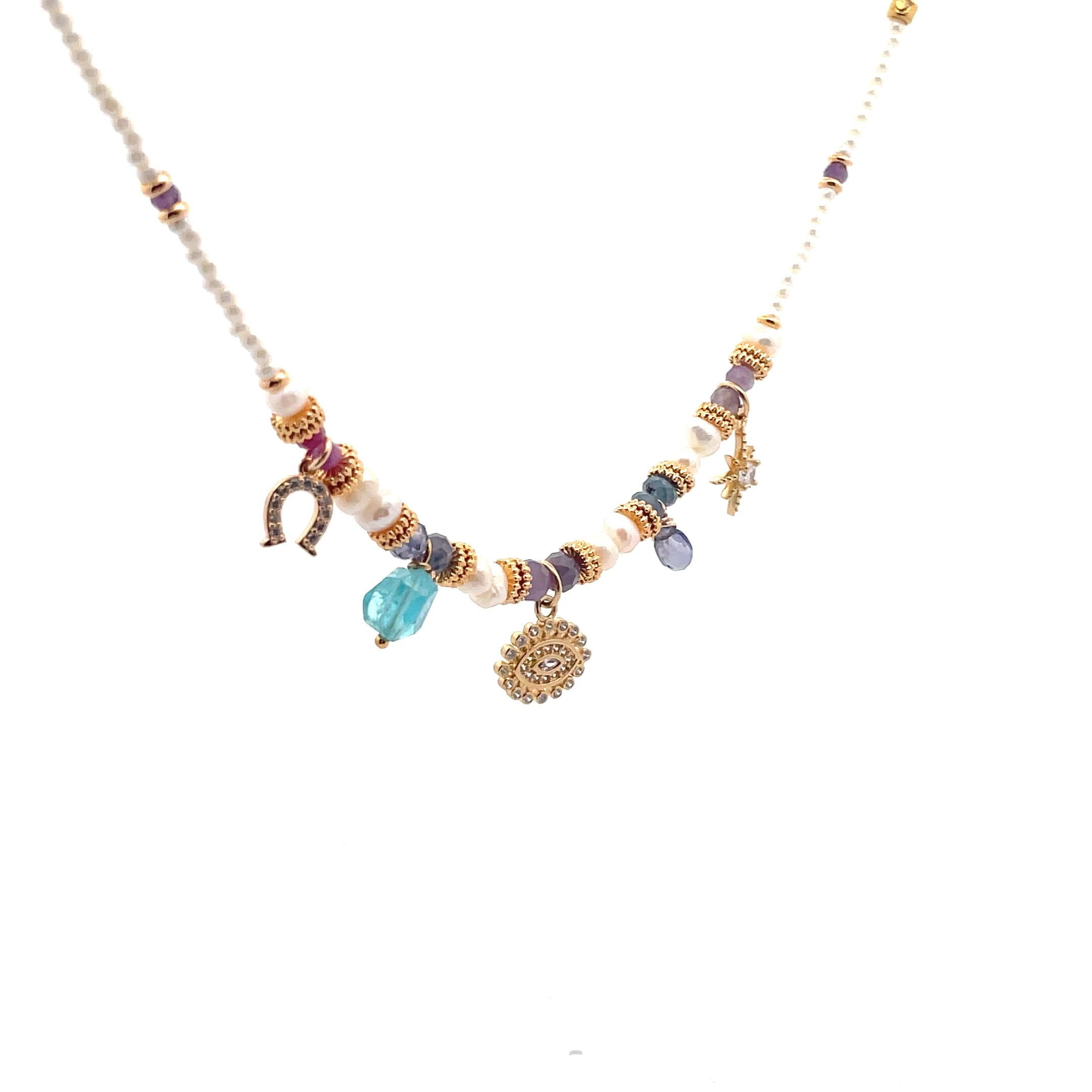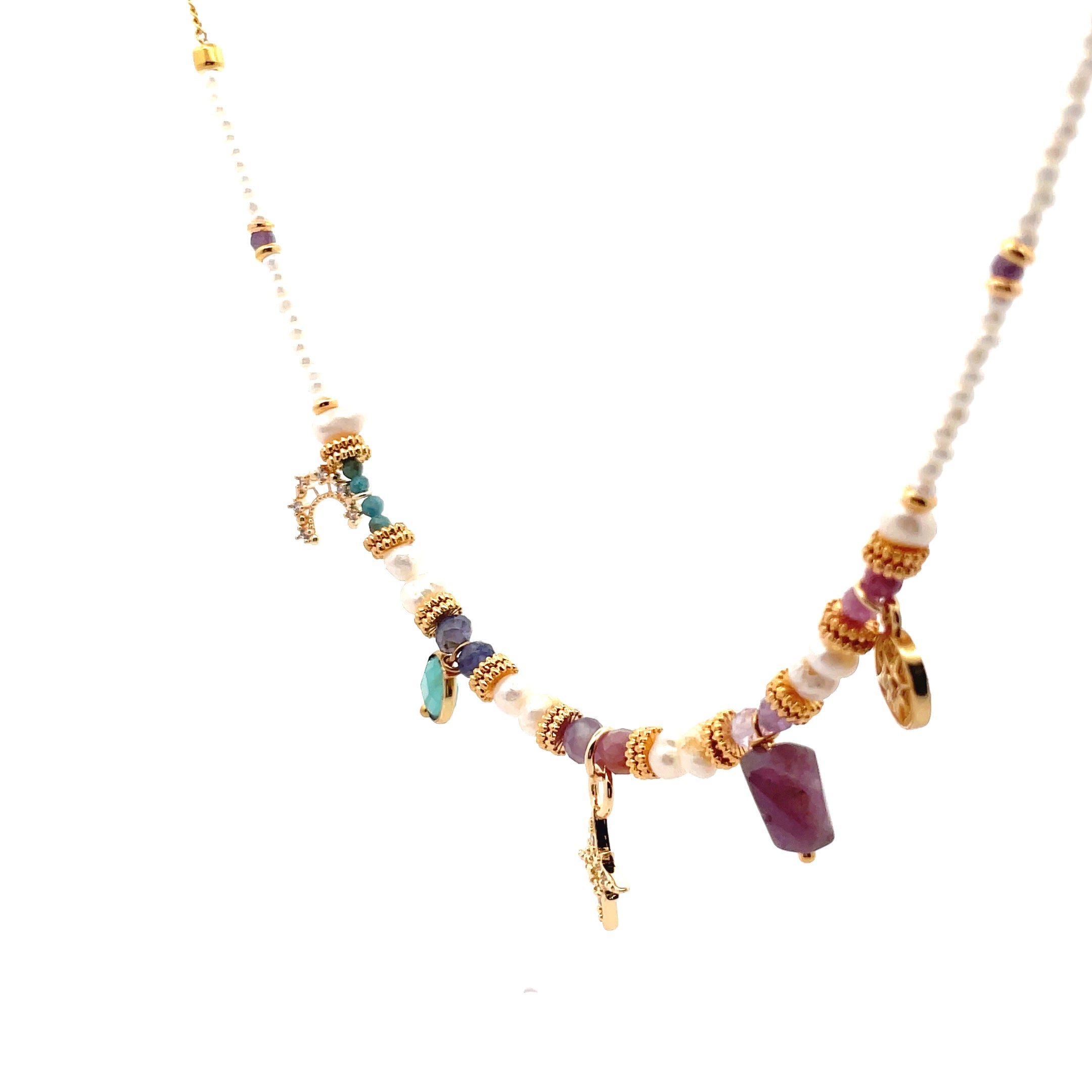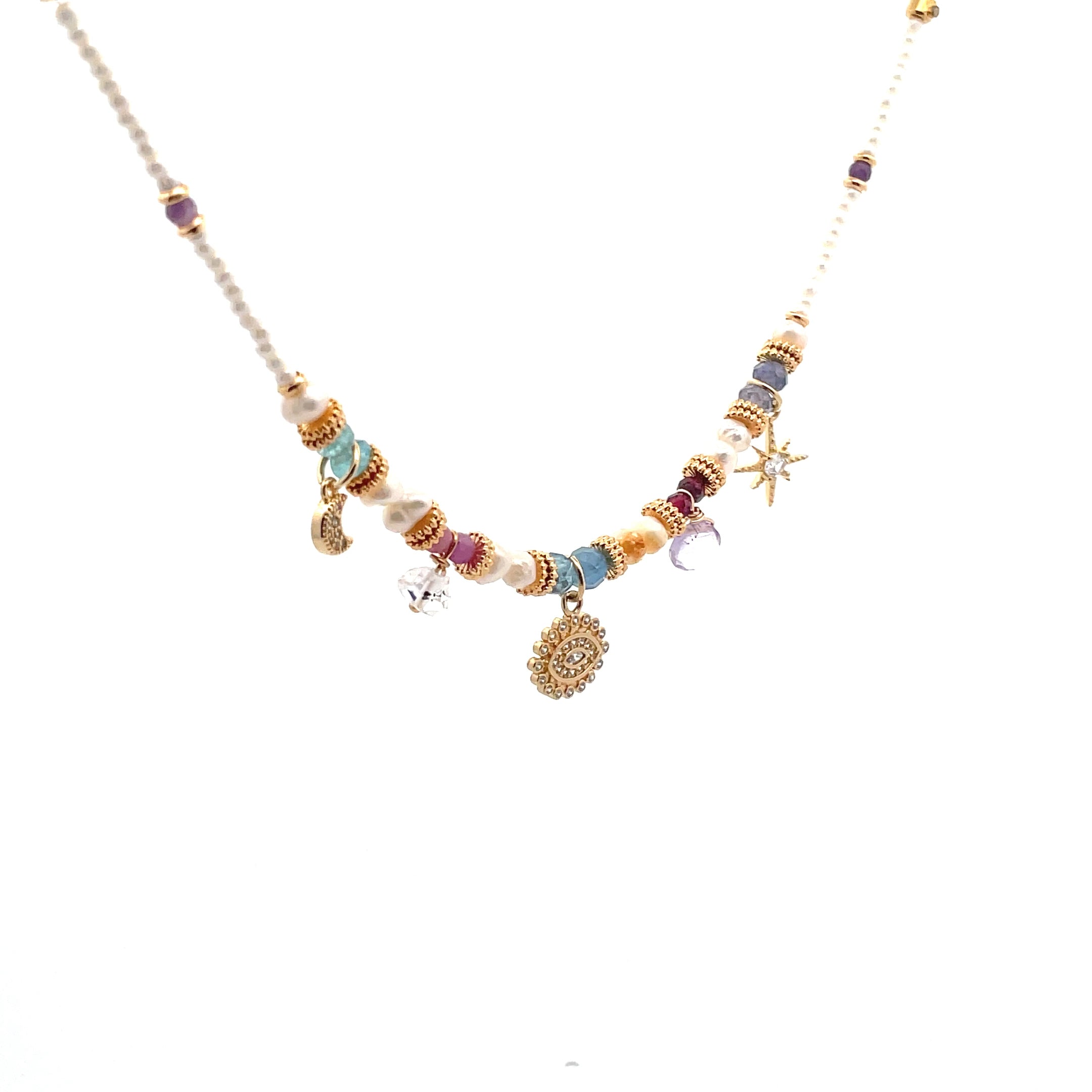 Collar con dijes de circonia de latón con baño de oro, miyuki aperladas, perlas, y multí piedras.