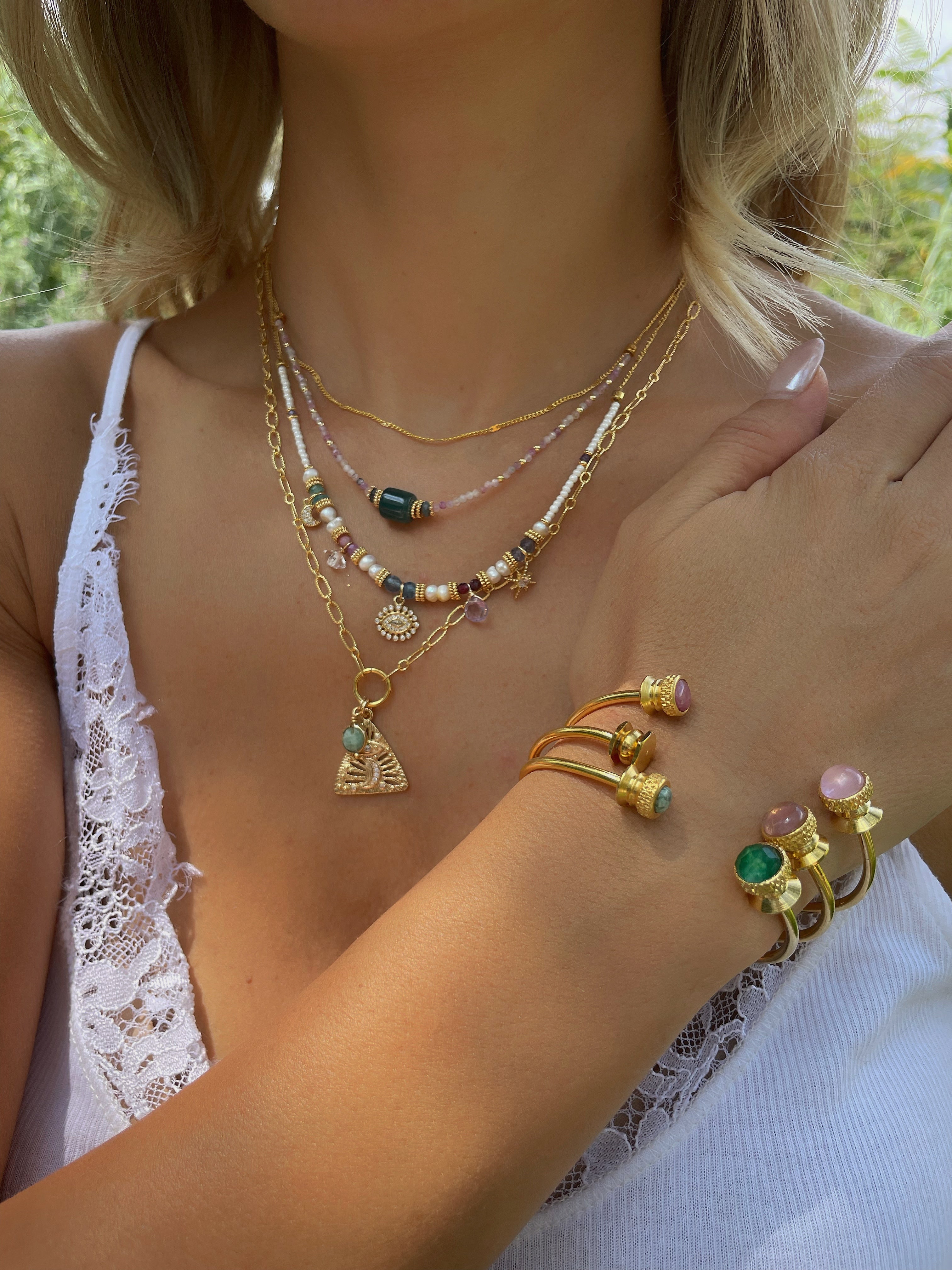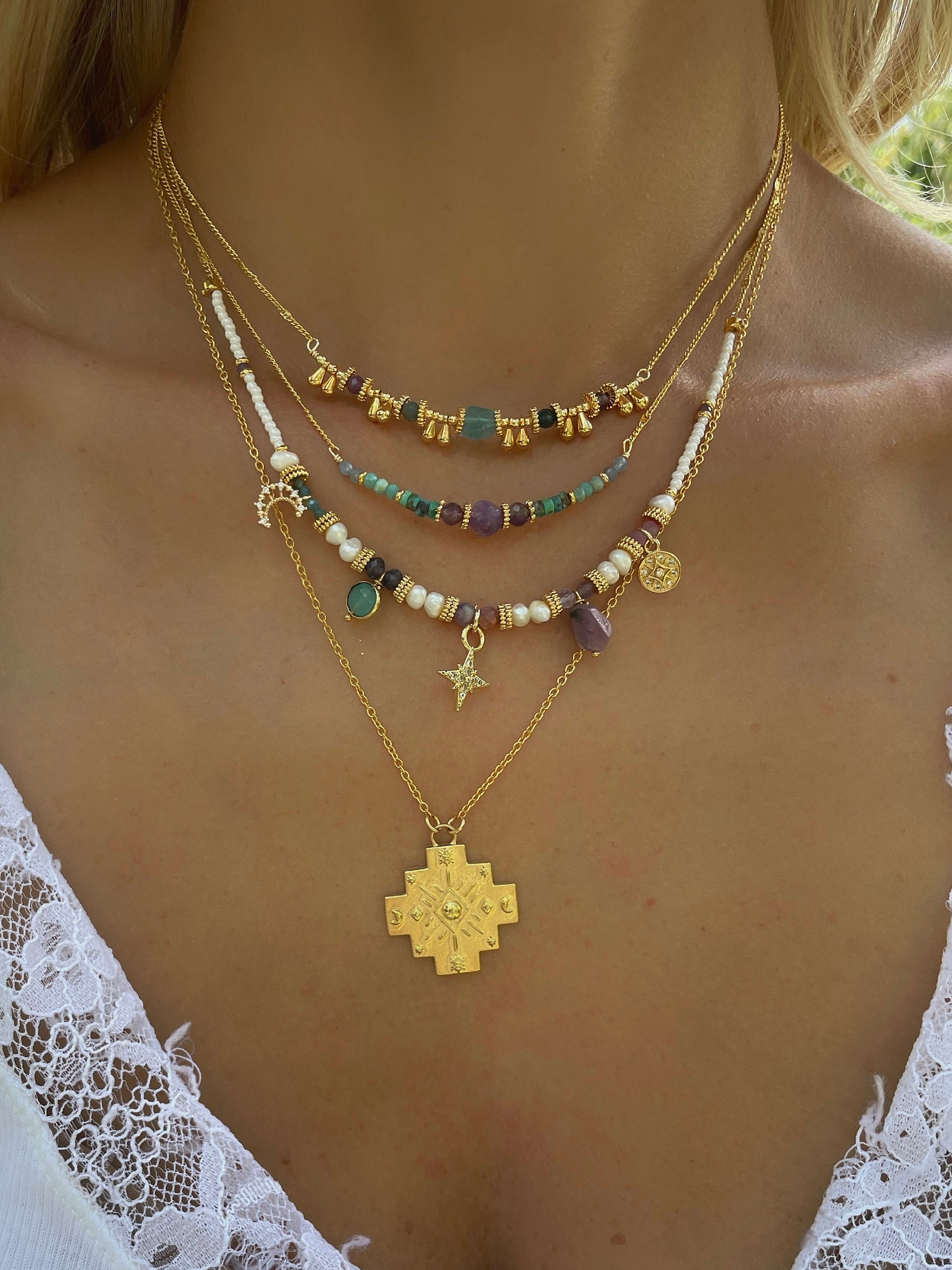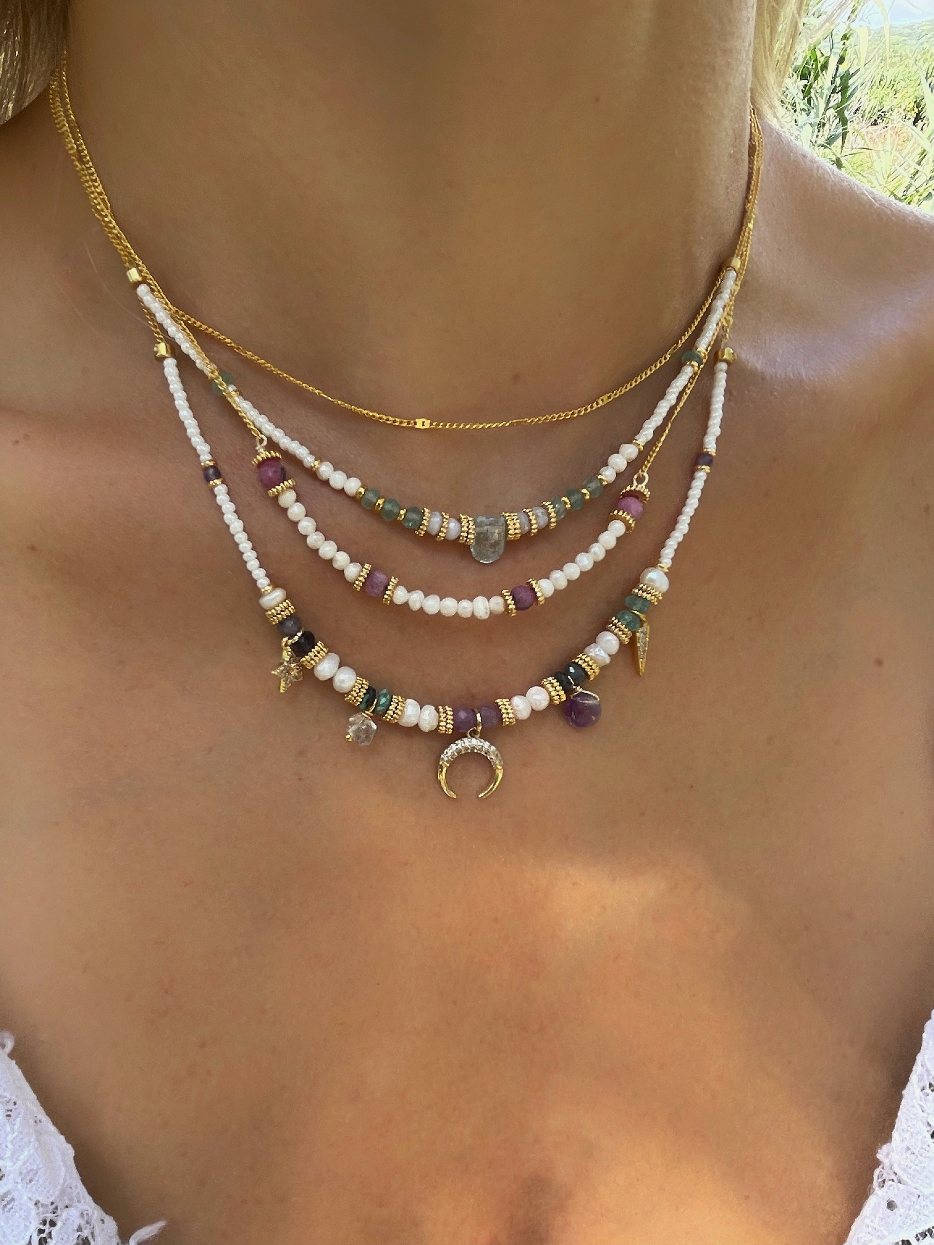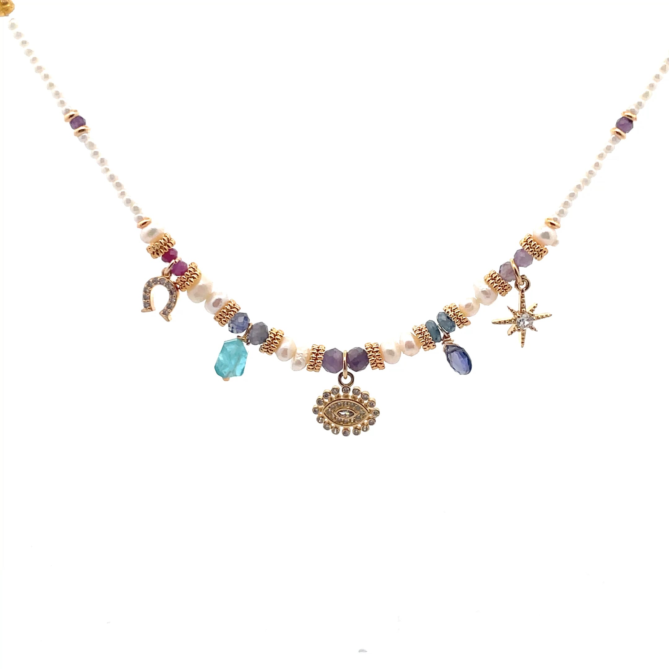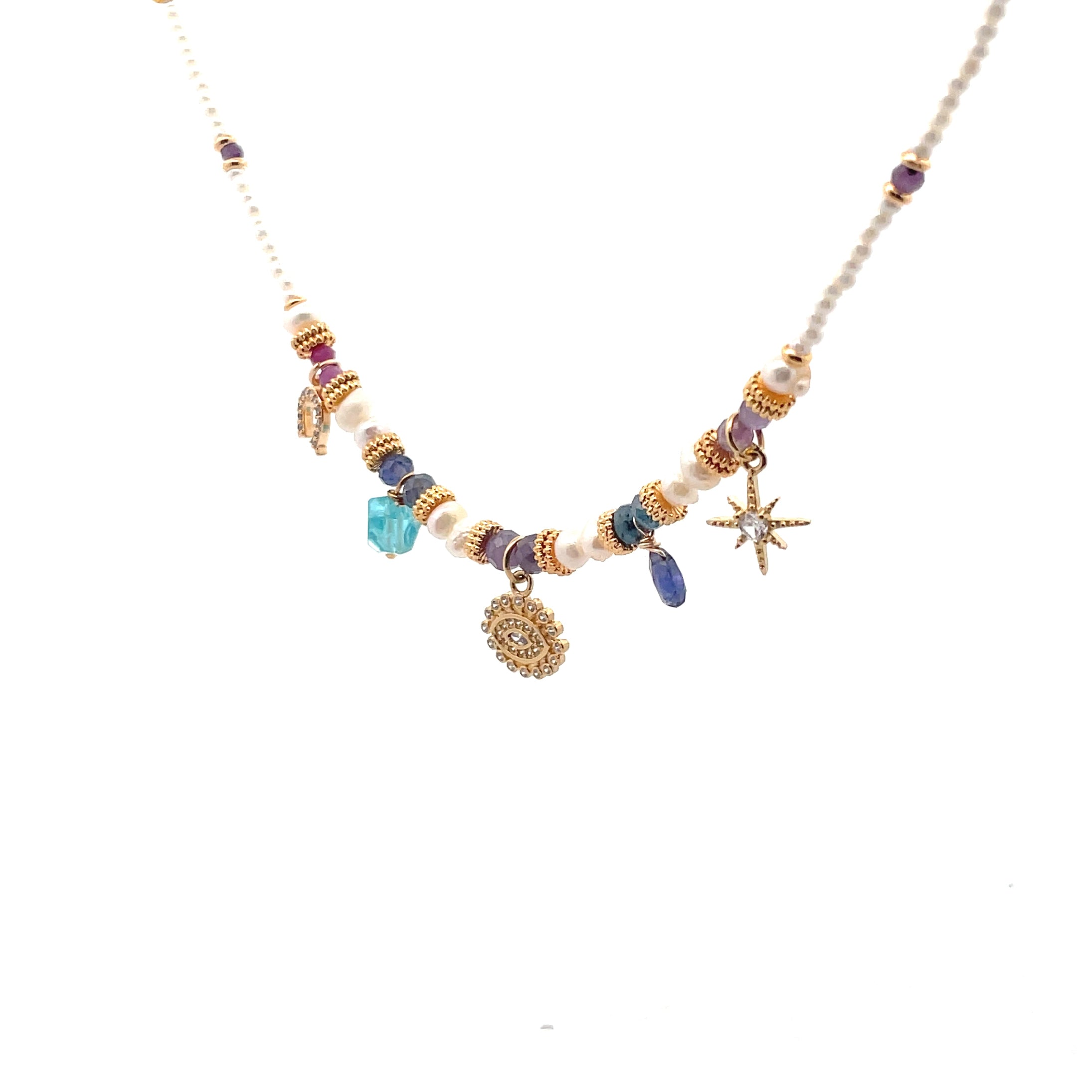 Collar con dijes de circonia de latón con baño de oro, miyuki aperladas, perlas, y multí piedras.