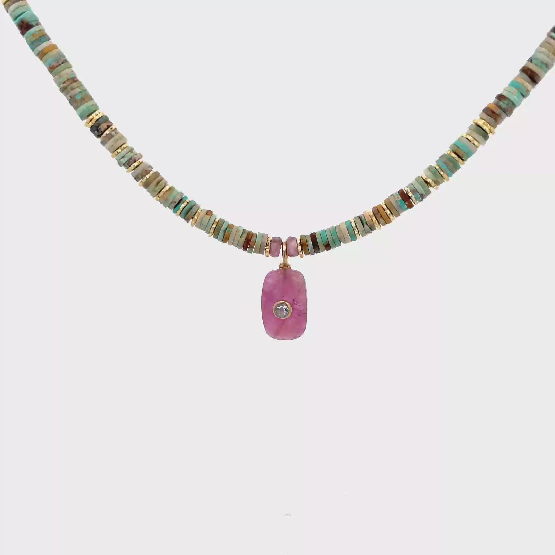 Collar con piedras de turquesa mate con dije central en corte rectangular pulis con aguamarina bicelada al centro.