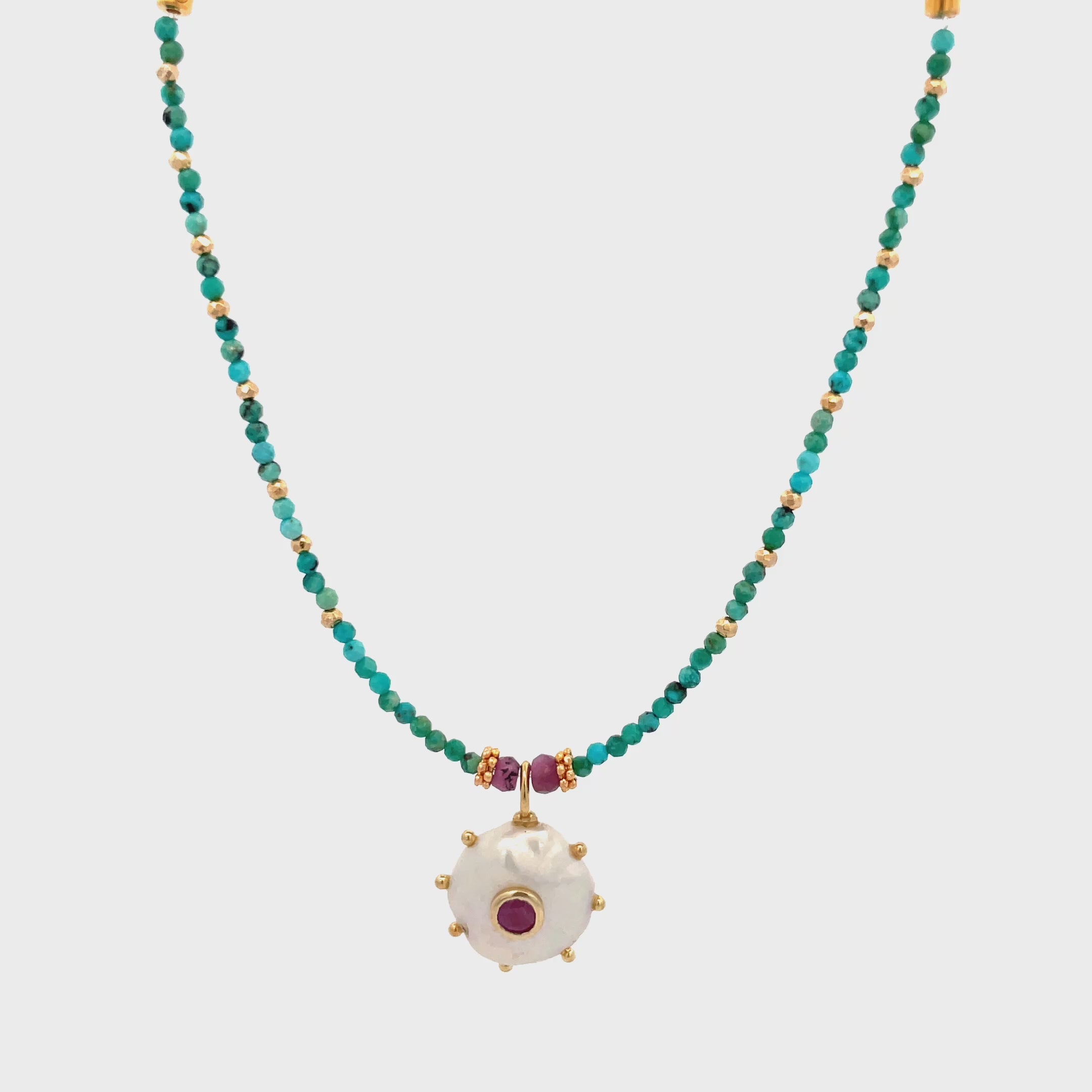 Collar con Fosfosiderita o turquesas, separadores dorados y perla con amatista o rubí al centro.