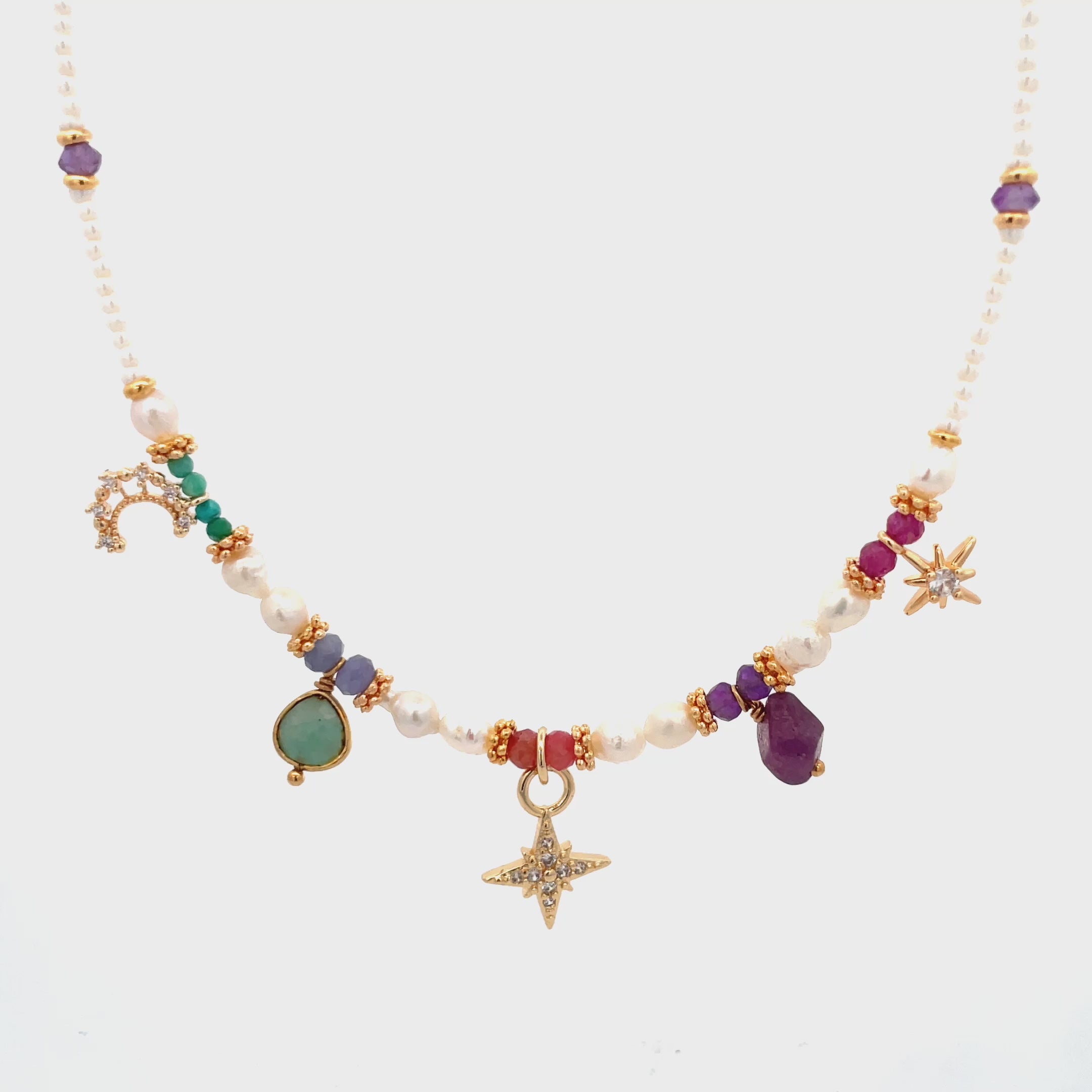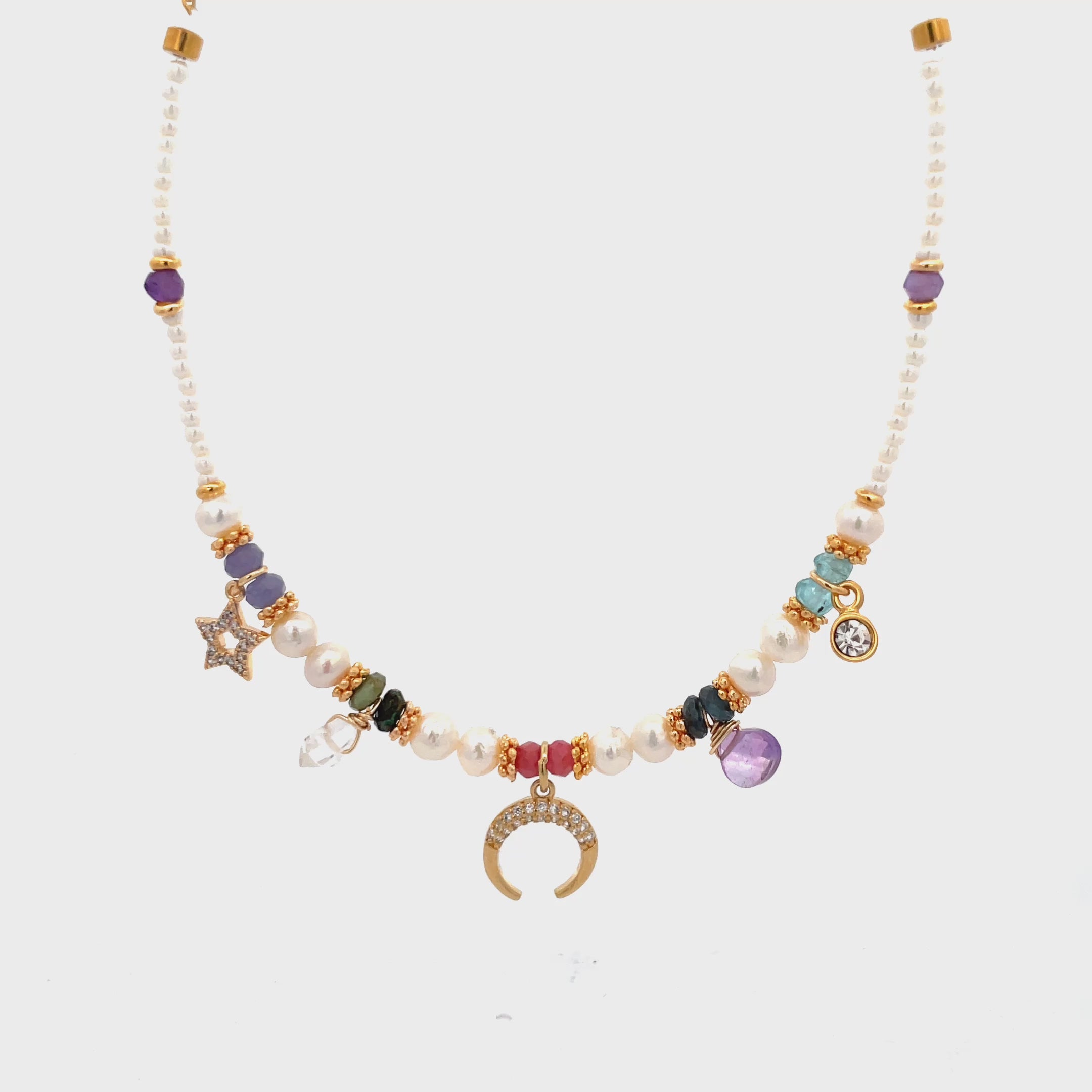 Collar con dijes de circonia de latón con baño de oro, miyuki aperladas, perlas, y multí piedras.